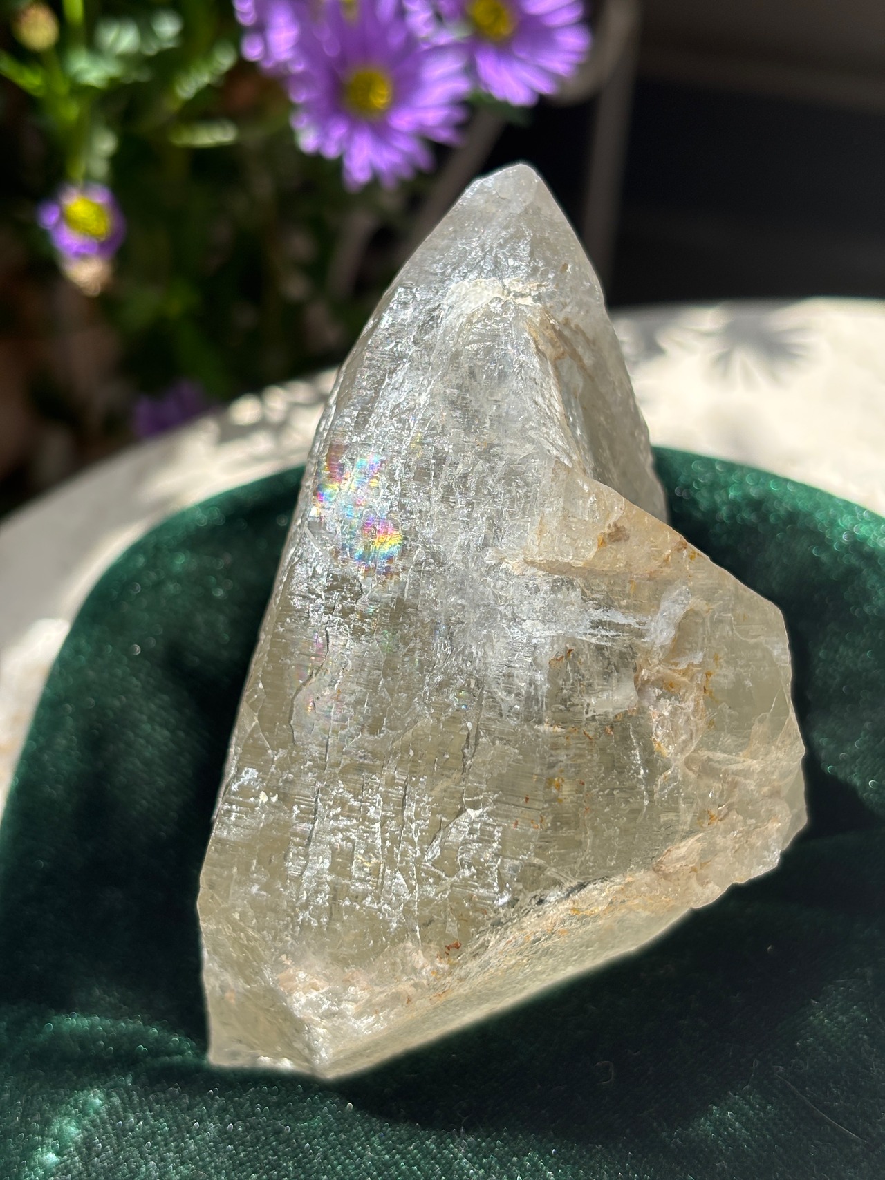 内側からはっきりと美しい虹が浮かび上がり、底面は一部セルフヒールドが始まっていて、何ともスターシード、オールドスターシードの魂に響くタイプだなぁと惚れ込みました。