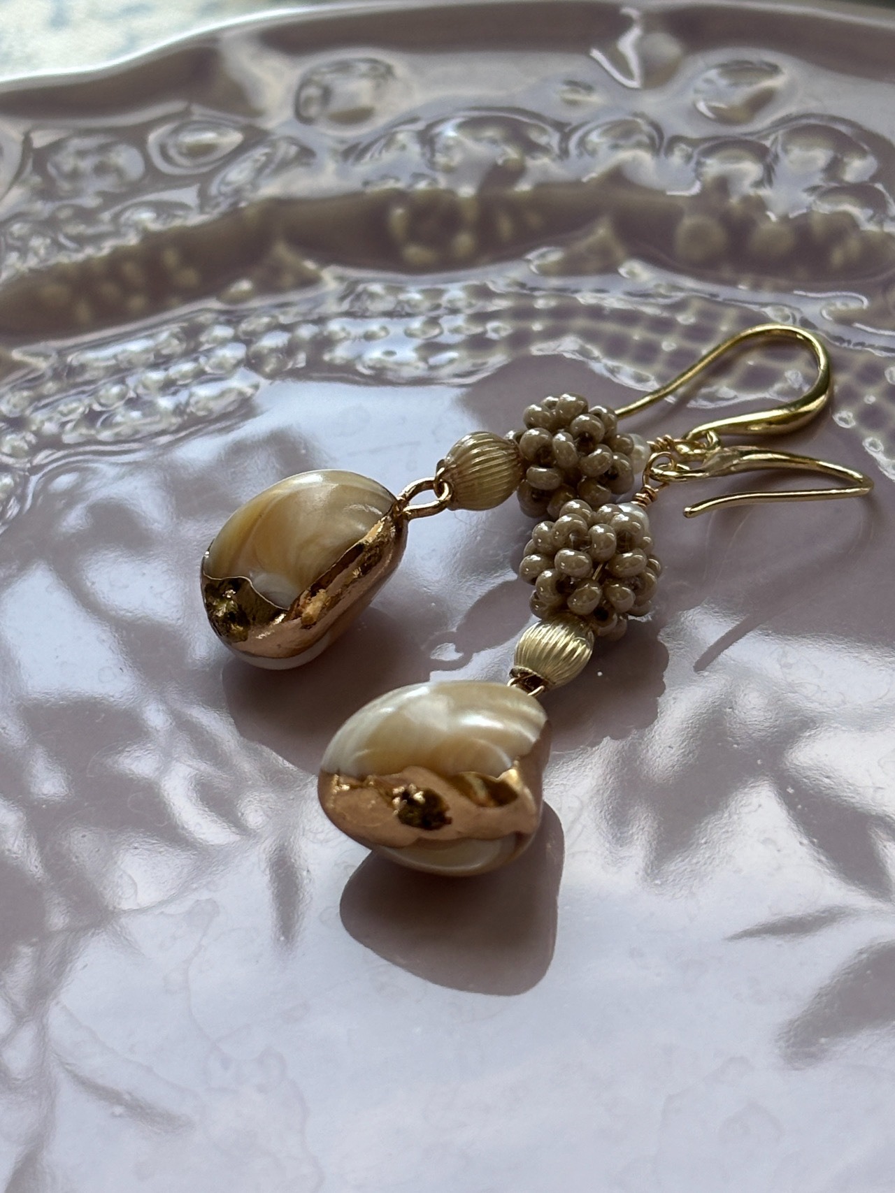 天然シェルの艶やかなベージュに、きらめきを宿したビーズボールとヴィンテージビーズを合わせたモダンなデザイン。